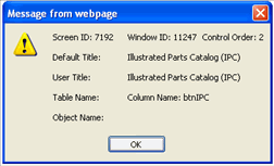 A window displays the Screen and Window IDs, Control Order, Default Title, and User Title of the control. If appropriate, it also displays the Table Name and Object Name.