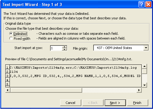 The Text Import Wizard - Step 1 of 3 dialog box appears.