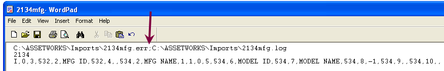 Header record (first line): File name and directory path of the .err (error) and .log files, separated by a semicolon. The file paths are based on where the file was saved during the template file creation process.