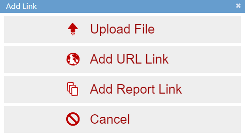 The Add Link dialog box allows users to select from three options to add a link or upload a file.